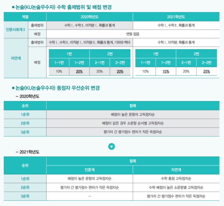 또 이번에 논술전형의 범위와 배점, 동점자 우선순위 기준이 바뀌었으니 참고하시길 바랍니다.